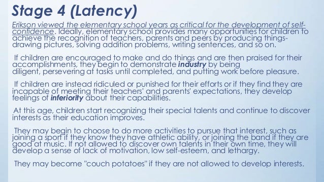 Inferiority-9375 stage 5 Identity vs. Eriksons stages of psychosocial development as articulated in the second half of the 20th century by Erik Erikson in collaboration with Joan Erikson is a comprehensive psychoanalytic theory that identifies a series of eight stages that a healthy developing individual should pass through from infancy to late adulthoodErikson published a book called Childhood and Society around the 1950s. As a student thechildren have a need to be productive and do work on their own.
